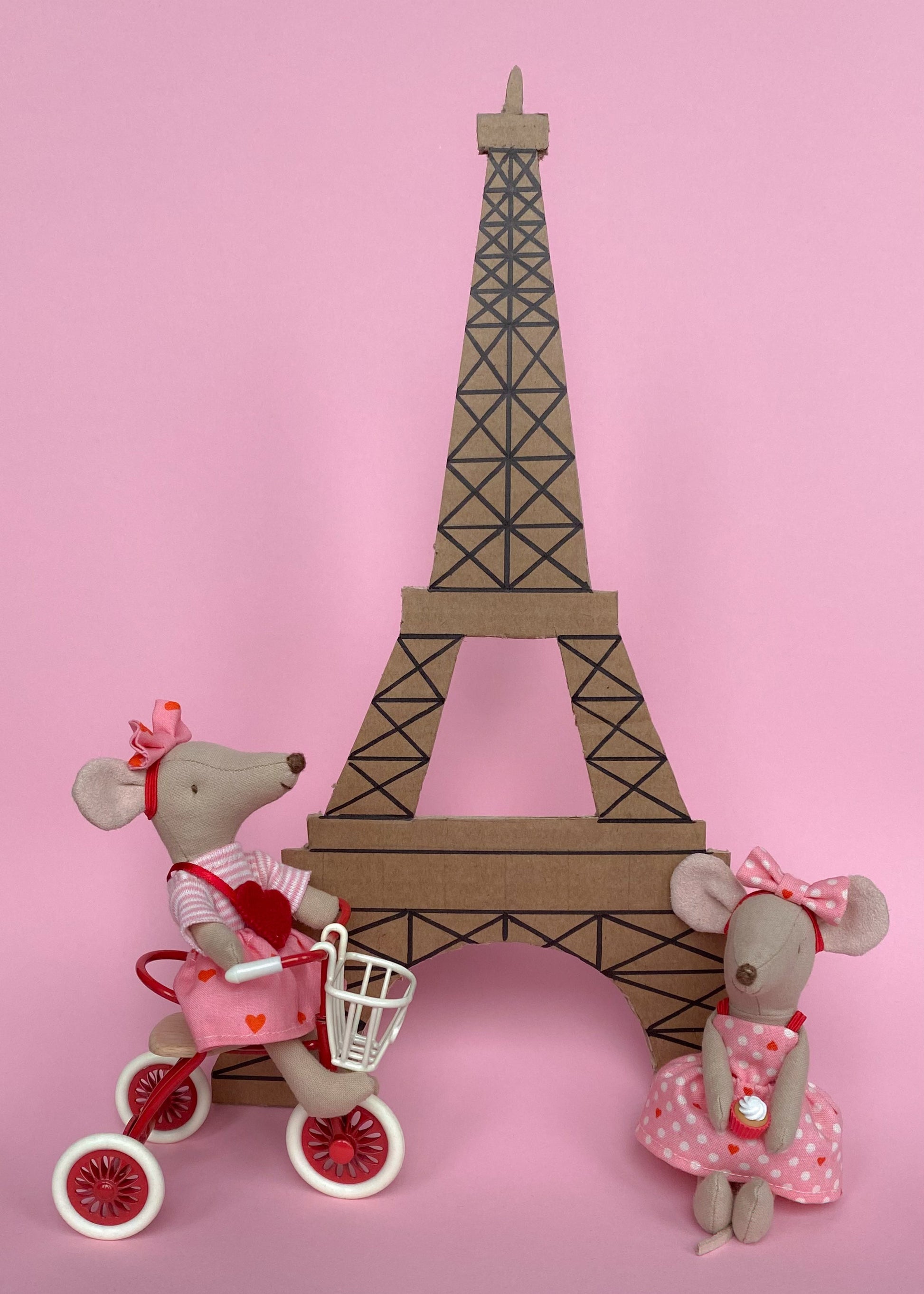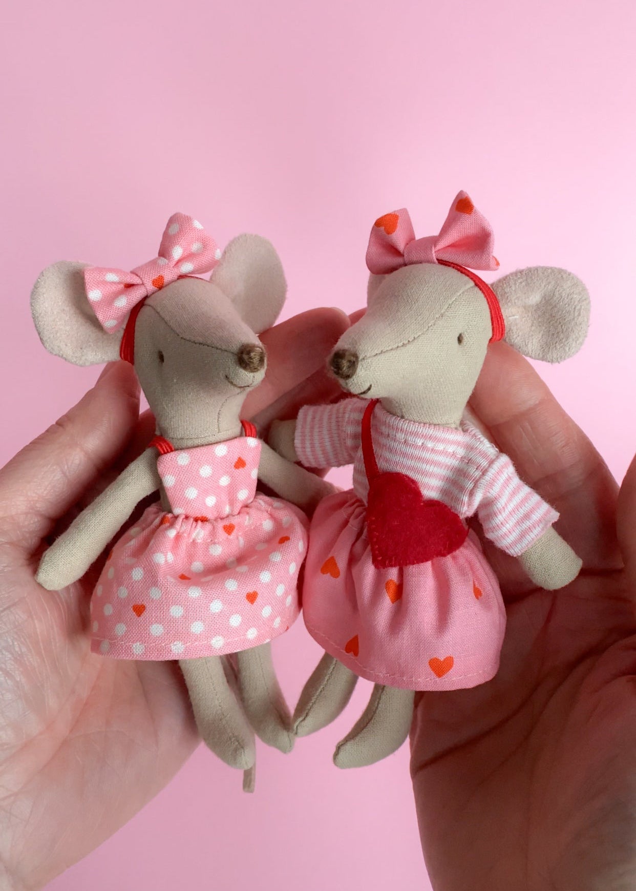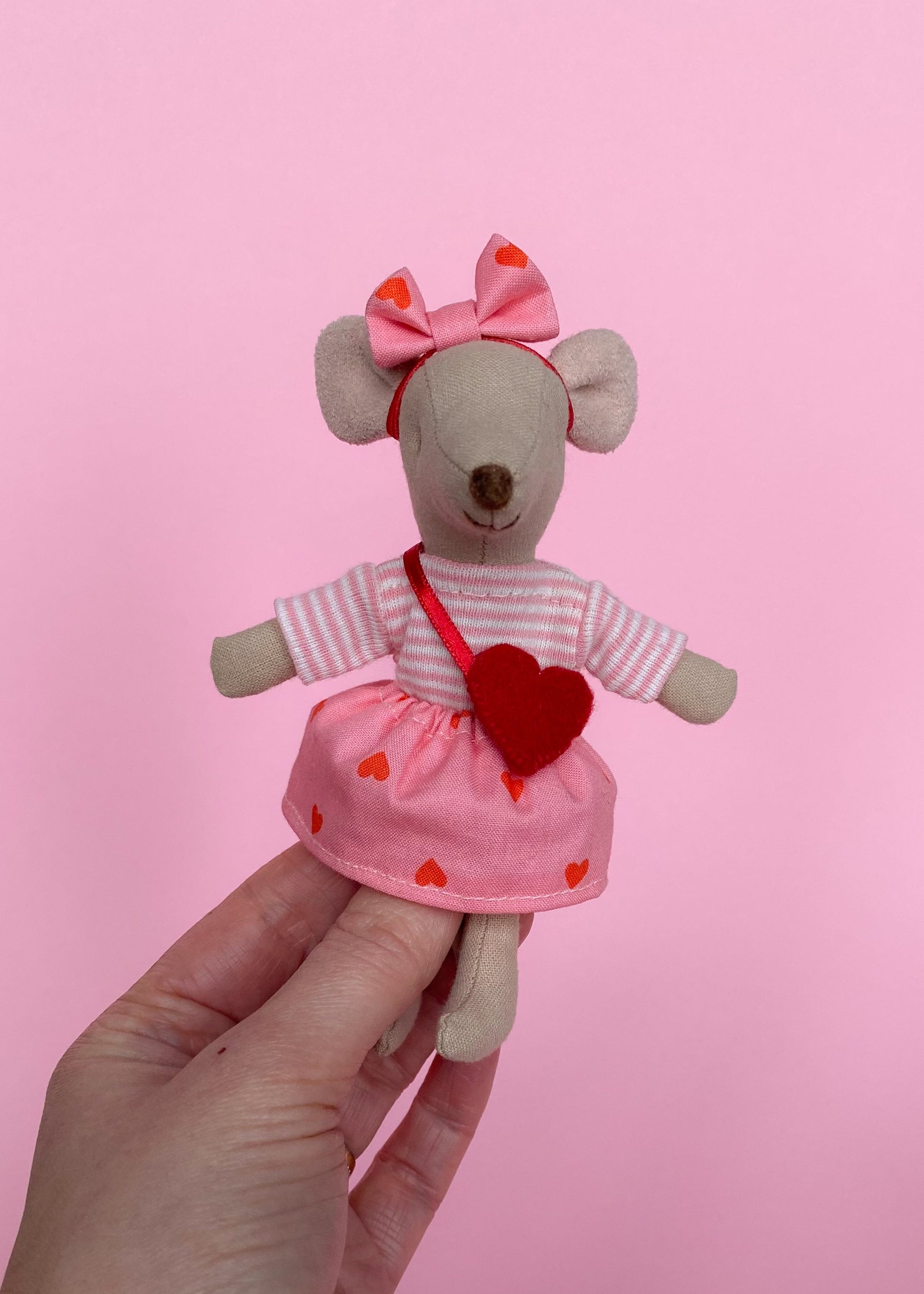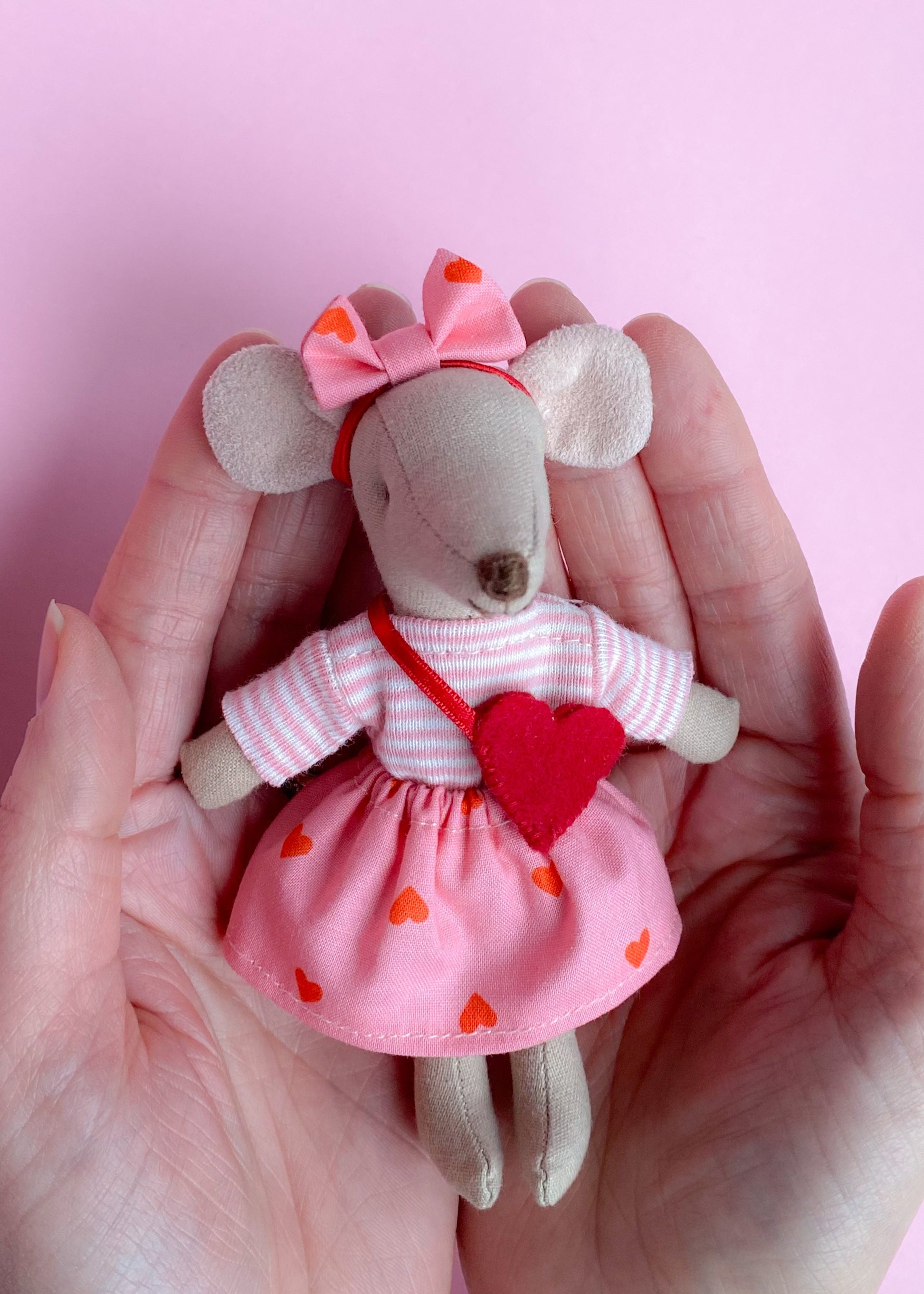 A cute Valentine’s outfit featuring a striped shirt, a bright pink heart‑print skirt and a matching headband with bow. Perfect for a sweet and playful look for your Maileg mouse.